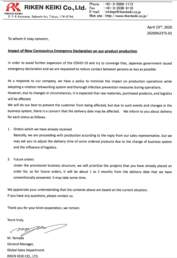 新型冠狀病毒應(yīng)急申報對我司產(chǎn)品生產(chǎn)的影響